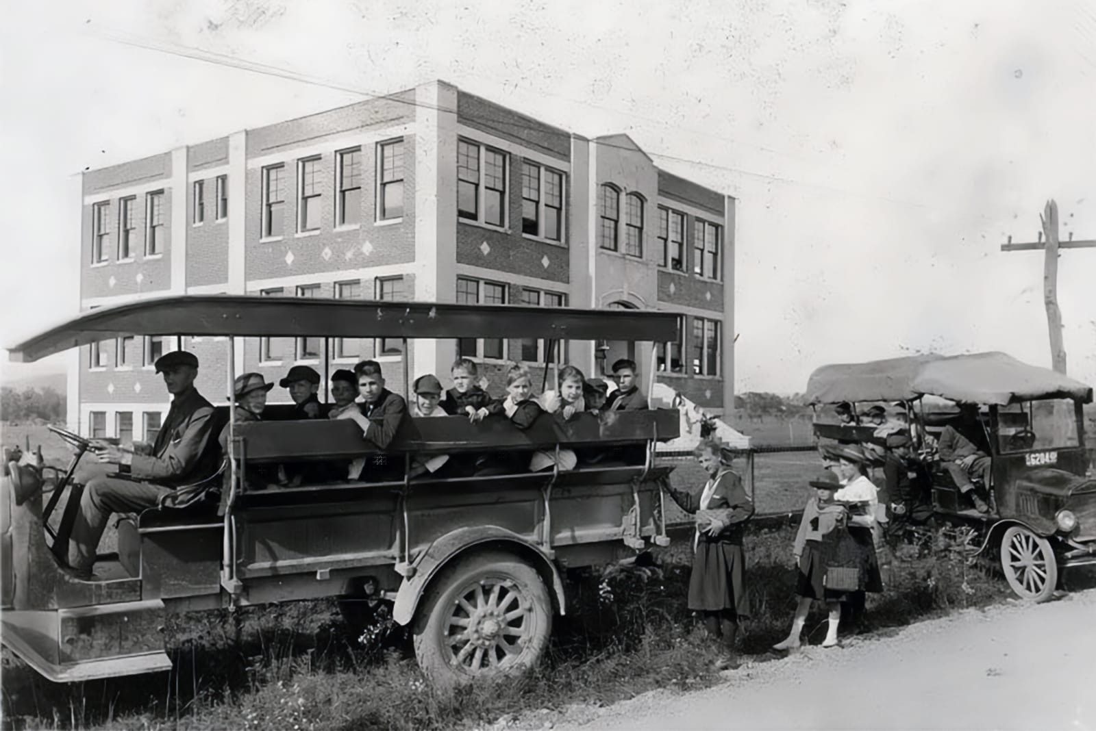 And while you'd see the occasional yellow vehicle, it was just one of many pigments painted onto buses, wagons, and family cars repurposed for school duty. There were no federally mandated stop arms, and no expectation that traffic would halt for a child on the roadside. The trip to and from school was a daily improvisation of getting bodies from scattered farms and neighbourhoods to the institutional centre.
